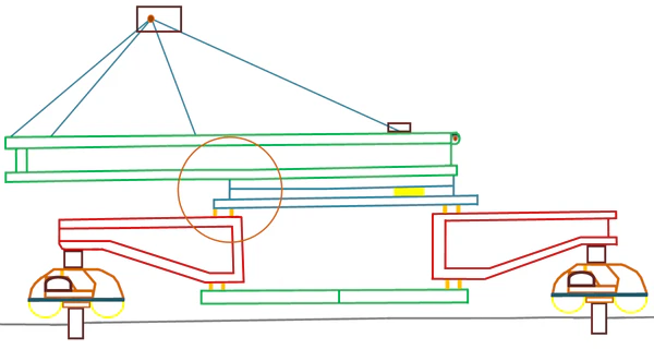 - Балочная стрела. Представляет собой сборную двухпоясную металлоконструкцию-ферму, верхний пояс которой выполнен из труб, нижний — из неравных уголков. Внутри фермы имеется ограждённый настил, предназначенный для прохода к механизмам. На балке головной секции расположены роликовые опоры. Балочная стрела может быть установлена либо горизонтально, либо под углом до 30 °. Перезапасовка канатов производится автоматически при переводе стрелы из горизонтального положения в наклонное (под углом 30 °) и обратно. Вдоль стрелы нижнего пояса стрелы перемещается грузовая тележка, оборудованная площадкой для обслуживания.[1].