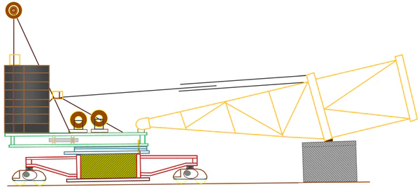 - Подъёмная стрела: состыковывают секции стрелы, устанавливается распорка, стрелу поднимают и соединяют с оголовком[1].