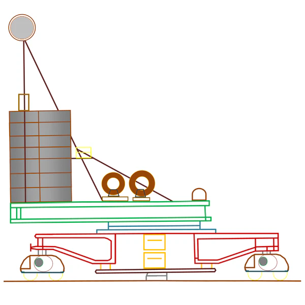 - Поворотная платформа — выполнена в виде плоской конструкции. Платформа опирается на ходовую раму с поворотными флюгерами (имеет в рабочем положении Х-образную форму) при помощи опорно-поворотное устройства, являющегося основным поворотным механизмом крана. Поворотный механизм представляет собой два поворотных круга и крепится в вильчатых опорах платформы. При монтаже на поворотную платформу устанавливаются основные грузоподъёмные механизмы крана — стреловая и грузовая лебёдки, которые имеют два рабочих режима — «спуск» и «подъём». Лебёдки используются при поднятии грузов, а также на этапах монтажа, демонтажа и изменения высоты крана. На подставке установлена съёмная аппаратная кабина с электрооборудованием с площадками. Также, в зависимости от размещения и способа монтажа, на платформе располагаются шкафы электрооборудования. На задних поперечных балках платформы уложены главные плиты противовеса (т) крана. Платформа оснащена шпренгельной фермой со съёмным монтажным подкосом, соединённым при помощи тяг. Подкос оснащён нижней обоймой полиспаста. На специальные кронштейны платформы устанавливают портал. С порталом платформа соединяется тягами и телескопическими подкосами.[1].
