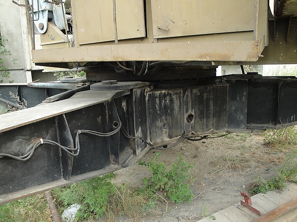 Ходовая часть крана называется ходовой рамой и представляет собой листовую конструкцию — кольцевую неповоротную раму с четырьмя проушинами, расположенными по диагоналям. Проушины предназначены для крепления съёмных поворотных балок (флюгеров), имеющих коробчатое сечение, трапециевидную форму и изготовленных при помощи сварки. При монтаже крана крепление флюгеров, с одной стороны, осуществляется к проушинам кольцевой (неповоротной) рамы — при помощи осей. С другой стороны, во втулки поворотных флюгеров устанавливаются шкворни ходовых тележек, которые могут перемещаться в вертикальном направлении (во втулках), будучи незастопорёнными. Стопорение производится посредством стопорного пальца, для которого на флюгере имеется отверстие[3]. В качестве ходовых тележек на кране используются универсальные балансирные двухколёсные тележки — две ведомых и две ведущих. Приводной электродвигатель ведущей тележки расположен сбоку от рамы тележки[9].