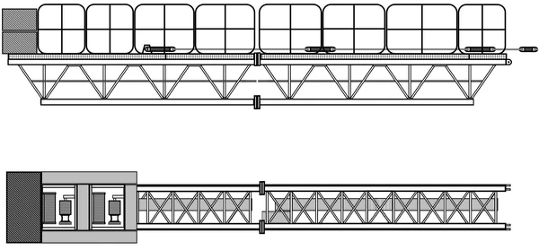 Консоль балочного типа, треугольной формы, состоящая из двух секций. Два верхних пояса выполнены из уголков, а нижний пояс, связи и раскосы — трубчатые. Стыки соединяются между собой фланцами. Элементы расчала консоли унифицированы с расчалом стрелы. На горизонтальной плоскости установлены две грузовые лебёдки и балластные блоки, доступ к которым осуществляется при помощи проложенного ограждённого настила и частично — поворотного, выполненного на шарнирах — над монтажной стойкой[2].