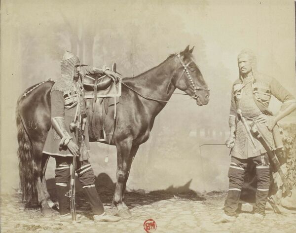 «Казаки и черкесы, в длиннополых черкесках с патронами на груди, обутые в суконные ноговицы и красные сафьянные чевяки, в лохматых бараньих шапках, с винтовкой в бурочном чехле, перекинутою за спину через правое плечо, при шашке и широком кинжале, скакали на неказистых, но крепких, неутомимых лошадях кабардинской породы. Маленькое черкесское седло и легкая тонкоременная уздечка видимо была приспособлены к дальнему походу, к жизни на коне. Не порывист их налет, но стойко встречают они противника, метко бьют из винтовки и рубят шашкой на убой. Лошади приезжены к покойному ходу, к быстрым поворотам, но не к прыжкам и дыбкам, только мешающим упорной, хладнокровной драке.» (Ф. Торнау)[12]