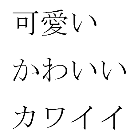 По предположению, происходит от стяжения древнего произношения «каваюй» или слова «каохаюси» (яп. 顔映ゆし) и является атэдзи, то есть произошло не от китайского слова «милый» (кит. трад. 可愛, упр. 可爱, пиньинь kě'ài, палл. кэай)[20]. Слово «каваий» пишется двумя кандзи: 可, при чтении онъёми, читается как «ка» и означает «быть достойным чего-либо»; и 愛, при чтении онъёми, читается как «ай» и означает «любовь»[21][22]. Их соединение означает «хорошенький, милый, славный, прелестный, крошечный». При объединении двух кандзи чтение второго кандзи меняется на «вай», чтобы избежать фонетического эффекта произнесения двух «а» подряд (ка-ай), так как это не распространено в японском языке[23]. Последний символ в слове, «-い» (-и) — это окончание предикативного прилагательного, одного из трёх классов японских прилагательных, наряду с полупредикативными, оканчивающимися на «-の» (-но) или «-な» (-на), и китайскими, оканчивающимися на «-的» (-тэки).