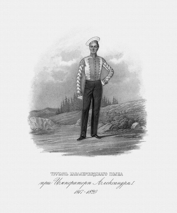 - мундир (парадный) — белый колет, фуражка — тулья белая, выпушка, околыш — алые, каска, кираса, лядунка (офицеры);