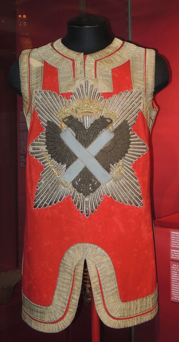 Дворцовая форма — колет, лосины, ботфорты, алый супервест с Андреевской звездой и светло-синей отделкой, каска, лядунка (офицеры).