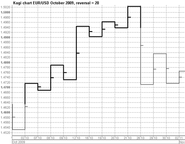 В графиках Каги изменения на график вносятся каждый раз, когда цена выходит за рамки уже нарисованной линии (в направлении тренда) или проходит установленное расстояние в противоположном направлении. Перед построением графика оговариваются:
