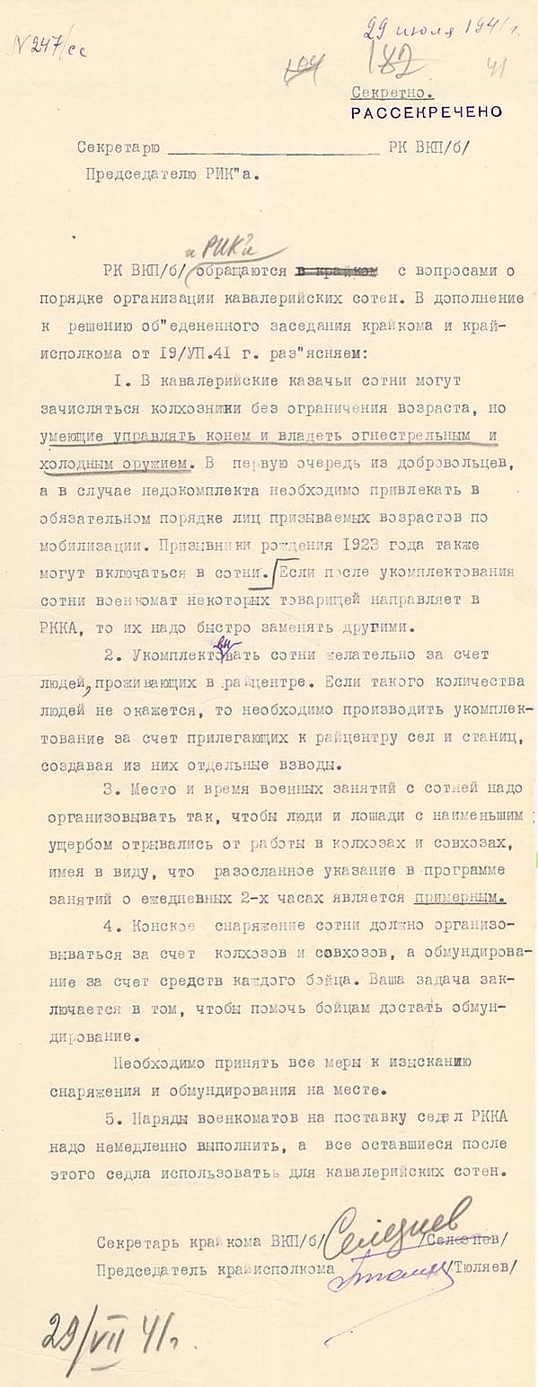 Специальным актом было восстановлено ношение ранее запрещённой казачьей формы[8]. Казачьими частями командовали Н. Я. Кириченко, А. Г. Селиванов, И. А. Плиев, С. И. Горшков, М. Ф. Малеев, В. С. Головской, Ф. В. Камков, И. В. Тутаринов, Я. С. Шарабурко, И. П. Калюжный, П. Я. Стрепухов, М. И. Суржиков и другие.