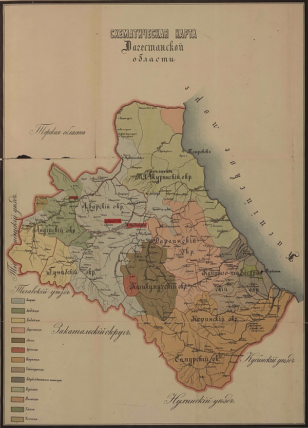 В 1895 году в уезде было 4 наибства: Аштикулинское (центр — с. Кули), Вицхинское (центр — с. Унчугатль), Кумухское (центр — с. Кумух), Мукарское (центр — с. Ури)[2].