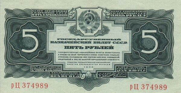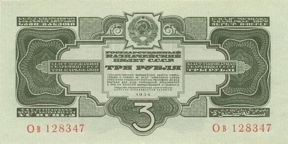 Казначейские билеты достоинством в 1, 3 и 5 рублей 1934 года выпуска внешне мало чем отличались от билетов более раннего выпуска. Оформление их было достаточно простое и скучное: бумага использовалась без водяных знаков, но с рисунками, состоящими из орнаментов, рамок и розеток. Расцветка купюр однотонная, на билете присутствовал государственный герб Союза Советских Социалистических Республик, а также надпись с достоинством билета на семи языках республик СССР.