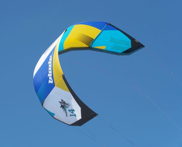 - Планочный кайт. Планочные кайты так же управляются четырьмя стропами, но есть существенное отличие — стропы управления не только затягивают правую, левую заднюю кромку крыла, а также изменяют угол атаки на воздействуемую сторону крыла. Этому способствует специальная настройка стропной системы. За счет этого появляется возможность не только управлять кайтом, но и изменять его подъемную силу, которая трансформируется в силу тяги кайта. Такие кайты называются De-power кайтами. Так как появилась возможность управлять силой тяги, эти кайты можно использовать в большем диапазоне скоростей ветра без перенастройки. Для управления используется планка специальной конструкции, которая может выполнять не только перекос, но и движение «от себя», «к себе», тем самым изменяя силу тяги кайта. Однако по сравнению с «ручечными» кайтами, планочный кайт немного проигрывает в управляемости.