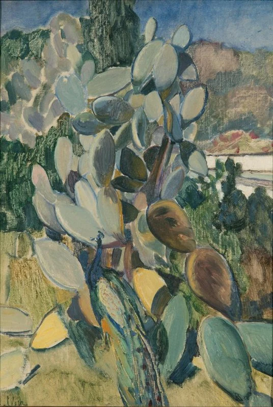 На переднем плане картины, на склоне горы, изображены серые листья кактуса. У подножия растения, почти сливаясь с ним, сидит павлин с длинным синевато-зелёным хвостом и высоким гребнем на голове. Такое построение композиции подчёркивает единство животного и окружающей среды.