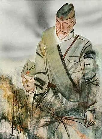 - Дед — старый солдат, разведчик. Спокойный, терпеливый и мудрый. Жалеет внука, но при этом разговаривает с ним как с равным: «Сам захотел узнать, что такое война. Теперь терпи. Война требует терпения»[1]. Решительный. Готов пожертвовать собой ради товарищей. Совершил подвиг: бросился под гитлеровский танк и подорвал его. Спас других бойцов ценой собственной жизни.