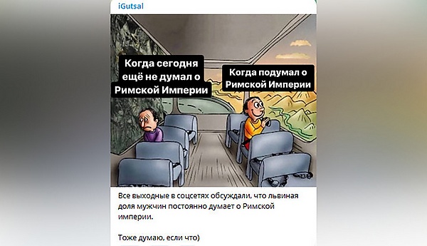 Шведская популярная блогер Саския Корт устроила опрос в соцсети Instagram, задав вопрос, почему же мужчины так часто думают о Римской империи? Согласно ответам мужчин, Римская империя фигурирует в их мыслях от одного до нескольких раз в день[4]. Сами мужчины отвечали, что «Римская империя — это круто» или упоминали о множестве военных, технических и архитектурных достижений римлян — например, организации легионов, использовании бетона в строительстве, системе канализации в Риме, возведении Колизея.