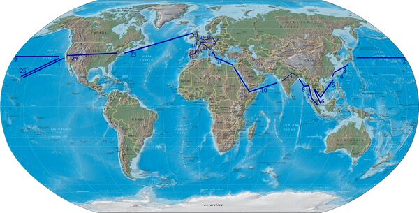 В 1881 году король отправился в путешествие по многим странам мира. В этой поездке он хотел изучить вопросы иммиграции и установить международные связи. Калакауа также хотел посмотреть на то, как правят другие правители. В его отсутствие, его сестра и будущая наследница Лилиуокалани управляла государством в качестве регента (Лелеайохоку). Брат короля, которого он ранее назначил наследником, умер в 1877 году. Король сначала побывал в Сан-Франциско, где ему был оказан королевский приём. После этого Калакауа отправился в Японию, где встретился с Императором Мэйдзи. Он продолжил путешествие в Китай, в Сиам, где был принят королём Чулалонгкорном, в Бирму, британскую Индию, в Египет, Италию, Бельгию, Германскую империю, Австро-Венгрию, Францию, Испанию, Португалию, Великобританию, и вновь посетил США, проехав по суше от Атлантического океана до Тихого, на пути домой. Во время этой поездки он встретился с папой римским Львом XIII, королём Италии Умберто I, правителем Египта Тауфик-пашой, с Вильгельмом II, императором Германии, Чулалонгкорном, королём Сиама, с новым американским президентом Честером Артуром и с королевой Великобритании Викторией. Он стал первым из королей, совершившим кругосветное путешествие[2].