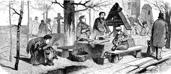 Первая неделя после Пасхи — Фомина неделя[1] была насыщена значимыми поминальными днями. Понедельник – «навий день», относился к умершим, день проводов покойников. Радуница — второй день, от слова «рад» — радость. Символическое соотнесение праздника мертвых с Воскресением Христа создавало общий настрой, веру в вечность и неувядание жизни. Радоница была праздником всенародным. Вся деревня выходила на кладбище к могилам своих близких. Женщины на могилах причитали, вспоминали об усопшем.