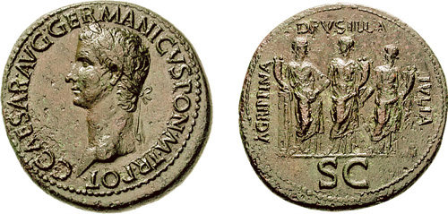 10 июня 38 года умерла Друзилла, любимая сестра Калигулы. Император бурно переживал её смерть, установил государственный траур. Сенат установил ей посмертные почести, во многом аналогичные тем, что получила Ливия, жена Октавиана Августа. Главным отличием стало её официальное обожествление (23 сентября того же года), и она стала первой женщиной, причисленной к богам римского пантеона[102]. Друзилле не посвятили свой храм, но это было связано лишь с тем, что её почитали в рамках культа Венеры — богини-покровительницы рода Юлиев. В храме Венеры ей была установлена статуя, аналогичная по размерам изображению самой богини[103][комм. 5].