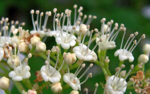 Цветки гетероморфные, с двойным околоцветником, собраны в плоские зонтиковидные 6-8 лучевые метёлки 5-8 см в диаметре[5], на цветоносе 2,5-5 см длиной[5]; все части соцветия голые или с рассеянными очень мелкими желёзками; краевые цветки на цветоножках 1-2 см длиной[5], бесплодные, плоские, белые, в 4-5 раз крупнее внутренних, 1-2,5 см в поперечнике[5], с пятью неравными обратнояйцевидными долями венчика; срединные — обоеполые, сидячие или почти сидячие, белые или розовато-белые, коротко-колокольчатые, около 5 мм в диаметре, с широкими тупыми лопастями, в 1,5 раза более длинными, чем трубочка. Соцветия расположены на верхушках молодых ветвей. Тычинок пять, они в 1,5 раза длиннее венчика, с жёлтыми пыльниками. Пестик с нижней трёхгнёздной цилиндрической завязью, с очень коротким коническим столбиком и трёхраздельным рыльцем. Цветёт в конце мая — начале июня в течение 10—14[6] (15—25) дней[7]:303.