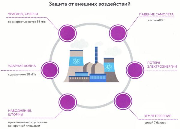 Высокая степень безопасности атомной станции базируется на множестве факторов. В их числе — принцип самозащищённости реакторной установки, наличие нескольких барьеров безопасности и многократное дублирование каналов безопасности. Также применяются активные (требующие вмешательства человека и наличия источника энергоснабжения) и пассивные (не требующие вмешательства человека и наличия источника энергии) систем безопасности.