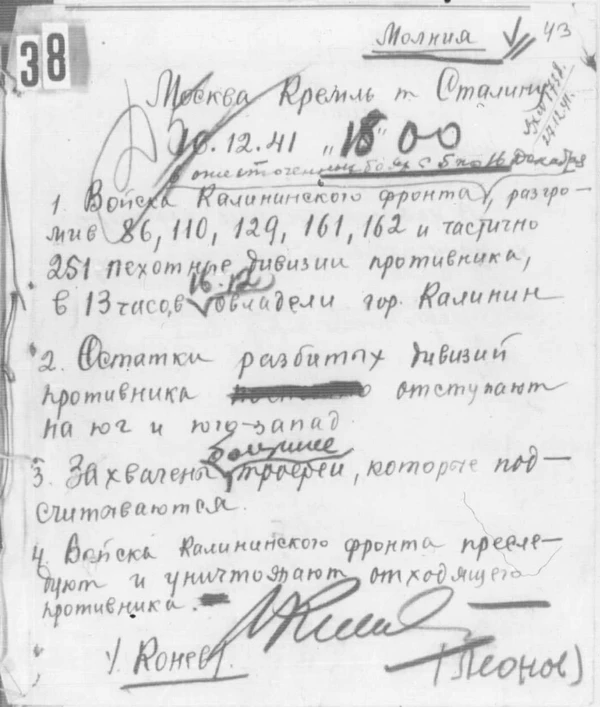 Боевой приказ № 019/оп командующего Калининским фронтом И. С. Конева об окружении и уничтожении калининской группировки противника. 16 декабря 1941 года