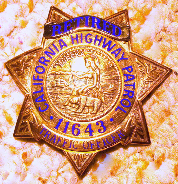 Значком калифорнийского дорожного патруля является золотая семиконечная звезда с печатью штата Калифорния в центре и лентой со званием владельца значка снизу. Окончания звезды содержат в себе листья дуба, а сам значок сделан из позолоченной латуни. Нашивка со звездой носится на тактической и ежедневной форме, а также по желанию на куртке.