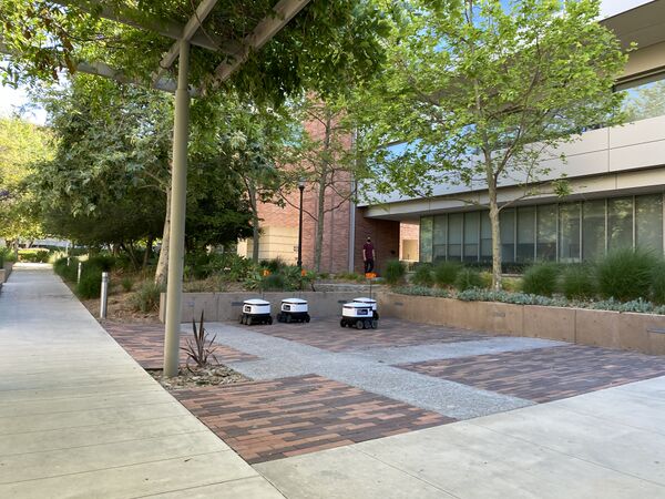 По территории кампуса ездят шестиколёсные беспилотники-доставщики еды, которые могут привезти еду или напиток в любую точку кампуса.