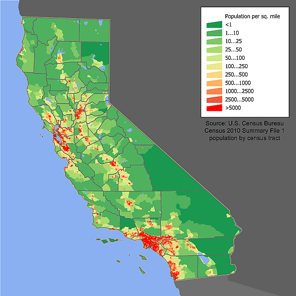 Калифорния является самым населённым штатом США (12 % общего населения), по результатам переписи населения 2000 года в Калифорнии проживало 33 871 648 человек, по оценке 2008 года — 36 756 666 человек, а по оценке 2014 года — 38 340 000 человек. Только лишь в округе Лос-Анджелес, самом населённом из всех округов США, проживает более 9 800 000 человек (42 штата США обладают меньшим населением). Средняя плотность населения в Калифорнии — около 91 человека на км² (11-е место в США). На увеличение численности с последней переписи повлиял как естественный прирост населения (в 2 549 081 человек), так и иммиграция — 1 825 697 человек приехали в Калифорнию из-за пределов США. Что касается внутренней миграции, то здесь число выезжающих из Калифорнии в другие штаты превышает число прибывающих на 1 378 706 человек[18].