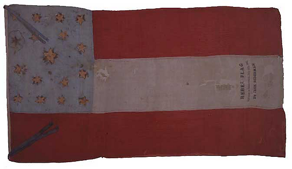 Единственный захват флага Конфедерации в Калифорнии во время Гражданской войны состоялся 4 июля 1861 года в Сакраменто. Во время празднования Дня независимости, сепаратист майор Джордж П. Гиллисс, инженер и ветеран мексиканской войны, отметил независимость Соединенных Штатов от Великобритании, а также южных штатов от Союза. Он развернул флаг Конфедерации по своему собственному проекту и двинулся вниз по улице к аплодисментам и насмешкам зрителей. Джек Бидерман и Кёртис Кларк, разгневанные действиями Гиллисса, приставали к нему и «захватили» флаг.[16] Флаг основан на Первом Национальном флаге Конфедерации, Звёздах и Барах. Тем не менее, кантон содержит семнадцать звёзд, а не семь звёзд Конфедерации.[17] Поскольку флаг был захвачен Джеком Бидерманом, его также часто называют «флагом Бидермана».