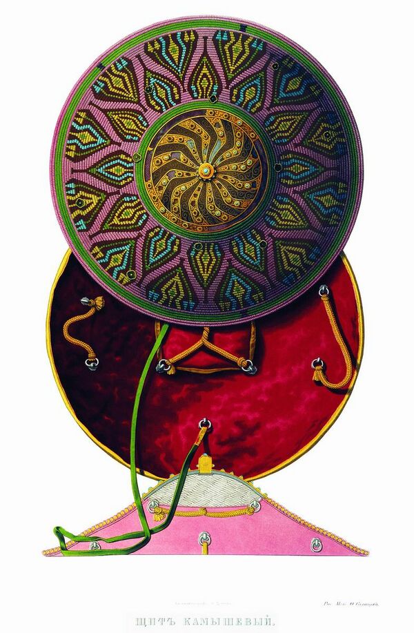 Калканы плелись из прутьев, которые сплетались в концентрические круги вокруг каркаса, таким образом, образуя выпуклую, коническую форму. После они оплетались цветными нитями. В центре щиты снабжались железным умбоном, а иногда дополнительно усиливались накладками, которые обычно закрывали заклёпки. В результате получалась лёгкая и прочная конструкция. Диаметр щитов составлял 40—70 см. Во время боя их удерживали ладонью за лямку. Под влиянием калканов в Азии появились аналогичные, но чуть меньшие щиты, сделанные из толстой кожи вместо сплетённых прутьев[1].