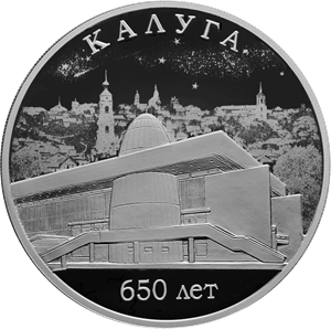 К предстоящему 650-летию Калуги Центральный банк России выпустил эксклюзивные серебряные монеты номиналом в 3 рубля, которые вошли в обращение с 14 июля 2021 года. В монете 31,1 грамма серебра 925-ой пробы, а диаметр круга — 39 мм. На лицевой стороне изображён герб РФ и обозначение металла по таблице Менделеева. На оборотной стороне изображён рельефное изображение здания Государственного музея истории космонавтики им. К. Э. Циолковского на фоне изображений панорамы города Калуги и звёздного неба; имеются надписи, вверху вдоль канта: «КАЛУГА», внизу: «650 ЛЕТ».