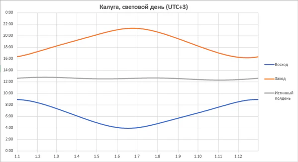 Калуга находится в часовой зоне МСК (московское время). Смещение применяемого времени относительно UTC составляет +3:00[15]. В соответствии с применяемым временем и географической долготой[16] средний солнечный полдень в Калуге наступает в 12:35.