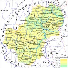 Калужская область расположена в центральной части Восточно-Европейской равнины[16]. Территория региона находится между Среднерусской (со средними высотами в пределах региона выше 200 м и максимальной отметкой 275 м на юго-востоке области), Смоленско-Московской возвышенностями и Днепровско-Деснинской провинцией.