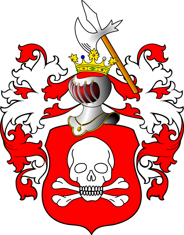 В красном поле серебряный череп на двух скрещенных серебряных костях. В клейноде над шлемом в короне серебряная алебарда (вправо), вбитая острием в корону.