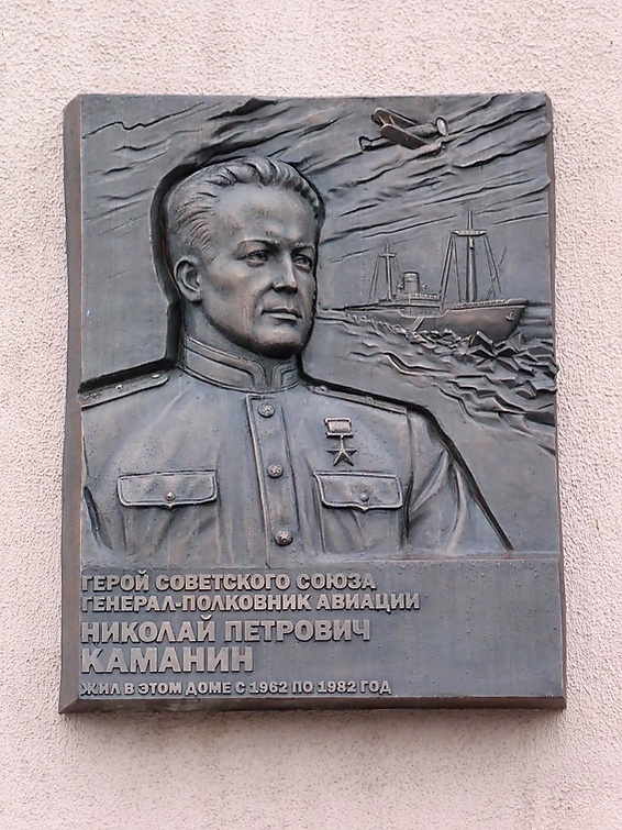 - Мемориальная доска в Москве размещена в 1997 году внутри подъезда в доме, где с 1937 по 1982 г. жил Н. П. Каманин (ул. Серафимовича, дом 2, подъезд 10)[26].
