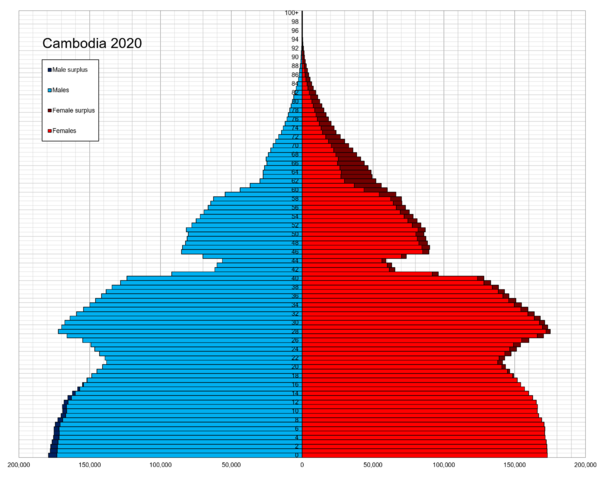 По данным на 2020 год население страны составляет 16 926 984 человек, свыше 97 % из них — кхмеры. Оставшаяся часть представлена главным образом тямами, вьетнамцами, китайцами и горными кхмерами. Прирост населения составляет на 2020 год примерно 1,4 %. Гендерный состав: 950 мужчин на 1000 женщин. Средняя продолжительность жизни составляет 65,9 года (63,4 лет — у мужчин и 68,6 лет — у женщин). Городское население по данным на 2020 год — 24,2 %. Уровень грамотности на 2018 год: 80,5 % (86,5 % мужчин и 75 % женщин)[15].