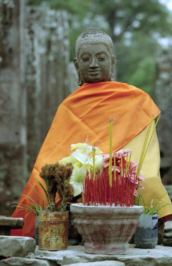 Буддизм исповедуют 97,9 % населения; ислам — 1,1 %; христианство — 0,5 %; другие религии — 0,6 %. Буддизм направления тхеравада является государственной религией Камбоджи[6], по всей стране находится около 4390 храмов. Традиции и повседневная жизнь подавляющей части населения тесно связаны с буддизмом. Большинство монастырей в стране принадлежало монашескому ордену Маханикай, хотя особым королевским покровительством пользовался менее крупный, но более влиятельный элитарный реформистский орден Тхаммаютникай. В 1975 году, с приходом к власти режима «красных кхмеров», на отправление всех религиозных культов был наложен запрет, который сохранялся вплоть до 1979 года. Тем не менее, с тех времён буддизм пережил возрождение, вновь заняв прочные позиции.