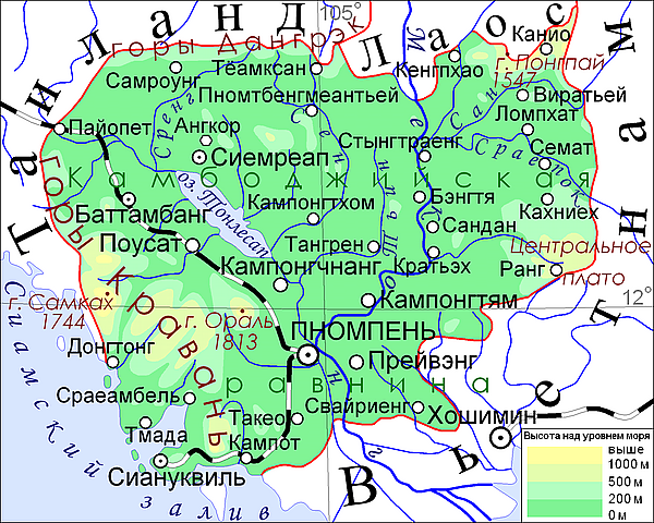 Горы Кравань расположены в направлении с северо-запада на юго-восток, достигают высот более 1500 м. Высшая точка Камбоджи, гора Ораль, находится в восточной части хребта и составляет 1813 м над уровнем моря. Хребет Элефан служит продолжением гор Кравань дальше на юго-восток, высоты составляют от 500 до 1000 м. К юго-западу от этих двух горных систем находится узкая прибрежная равнина Кампонгсаомбай, примыкающая к Сиамскому заливу. Невысокий хребет Дангрэк служит северной границей бассейна Тонлесап и проходит по границе с Таиландом. Средние высоты составляют всего около 500 м, а высшая точка превышает 750 м над уровнем моря. К северу от хребта находится плато Корат, занимающее северо-восток Таиланда.