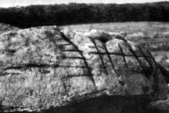Каменная Могила — так в Мелитопольском уезде называется бугор, состоящий из огромных груд песчаника и находится на правом берегу реки Молочной… взгромождённые тут природою камни, то выступают из земли, то склоняясь в противоположные стороны, образуют как бы навесы…один из моих проводников, в детстве с товарищами, видел на стенах надписи, из коих одна была длиною в аршин и более…[5].