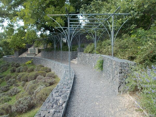 Габион — это корзины (сетки), обычно из оцинкованной стали, заполненные камнями среднего размера, которые действуют как единое целое и уложены так, чтобы сформировать облицовку или подпорную стену. Их преимущество состоит в том, что они хорошо дренированы и гибки, а также устойчивы к паводкам, потоку воды сверху, морозу и почве. Их срок использования составляет лишь то время, пока цела проволока, из которой они состоят, и, если она используется в суровых климатических условиях (например, на берегу в среде с солёной или кислой водой), должна быть изготовлена с соответствующей антикоррозийной защитой (покрытием)[~ 21].