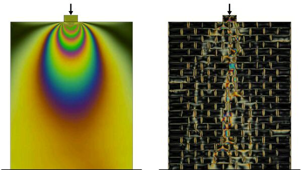 С точки зрения моделирования материала, кладка представляет собой особый материал с экстремальными механическими свойствами (с очень высоким соотношением прочности на сжатие и на растяжение), так что приложенные нагрузки не рассеиваются, как в упругих телах, но имеют тенденцию[18] (см. рисунок справа и видео для получения более подробной информации).