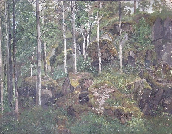 На полотне представлен летний пейзаж, в центре внимания которого находятся крупные валуны, покрытые мхом и образующие склон. В верхней правой части композиции видна вершина холма с растущими на ней деревьями. Среди валунов располагаются тонкие высокие стволы деревьев, чьи кроны выходят за верхний край картины. На переднем плане изображены зелёная трава и мелкий кустарник. Работа выполнена в зеленовато-коричневой цветовой гамме с преобладанием зелёных оттенков.