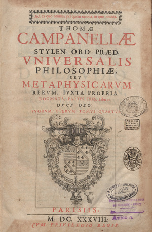 - Ludouico Iusto 13. regi Christianissimo. Ad Christianæ rei patrocinium. Dedicat fr. Thomas Campanella, Ordin. prædicat. tres hosce libellos, videlicet Atheismus triumphatus, seu contra Antichristianismum, &c. De gentilismo non retinendo. De prædestinatione & reprobatione & auxiliis diuinæ gratiæ cento Thomisticus. — Parisii : apud Tussanum Du Bray, 1636.