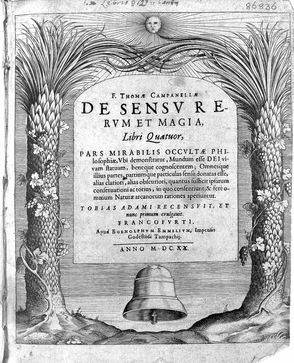 - F. Thomae Campanellae De sensu rerum et magia, libri quatuor: pars mirabilis occultae philosophiae, vbi demonstratur, mundum esse Dei vivam statuam, beneque cognoscentem, omnesque illius partes, partiumque particulas sensu donatas esse, alias clariori, alias obscuriori, quantus sufficit ipsarum conseruationi ac totius, in quo consentiunt, & ferè omnium naturae arcanorum rationes aperiuntur. — Francforti : Apud Egenolphum Emmelium, impensis Godefridi Tampachij, 1620.