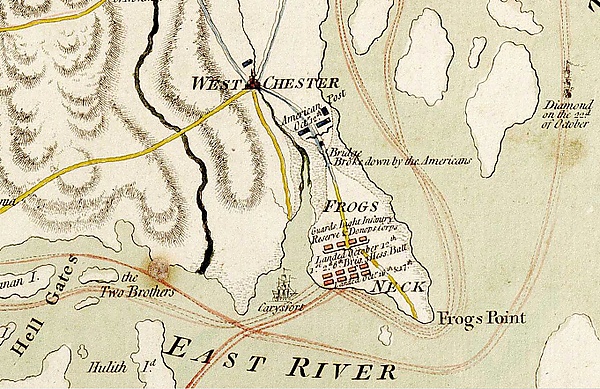 В это время генерал Хау 26 дней планировал дальнейший ход кампании. Он полагал, что фронтальная атака американских позиций нежелательна, а местность позволяет обойти противника с тыла. Он решил высадить армию на полуострове Фрогс-Нэк, оттуда по дороге выйти в Кингс-Бридж, оказаться в тылу армии противника и прижать её к Гудзону. Вечером 12 октября основная часть британской армии погрузилась на 80 кораблей, пересекла пролив Хелл-Гейтс и высадила авангард в 4000 человек на Фрогс-Нэк. Три бригады под командованием лорда Перси остались на позиции у Гарлемских высот. Высадившись на полуострове, британский авангард начал марш на Кингс-Бридж, но выйти с полуострова можно было только через заболоченный перешеек, который охраняли стрелки 1-го пенсильванского полка под командованием полковника Эдварда Хэнда. Когда британцы подошли к перешейку, 25 пенсильванцев открыли по ним такой точный огонь, что британцы в беспорядке отступили до ближайшей возвышенности и более не предпринимали попыток прорыва. Отряд Хэнда был сразу же усилен полком Уильяма Прескотта и полком Джона Грэма, и таким образом силы обороняющихся возросли до 1800 человек[34].