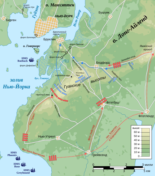 На рассвете 22 августа три британских фрегата заняли позиции у местечка Грейвсенд-Бей на Лонг-Айленде и началась переправка войск на остров. К полудню вся армия, 15 000 человек, оказалась на острове, не встречая сопротивления. Армия встала лагерем около берега; теперь между ними и американским лагерем на Бруклинских высотах находилась цепь холмов высотой 100—150 футов, который назывались Гуанскими высотами. Вашингтон ещё 24 августа был уверен, что на остров высадилась лишь небольшая часть британской армии, около восьми тысяч, а основная часть готовится атаковать Манхэттен, поэтому именно на Манхэттене держал самые надёжные части[17].