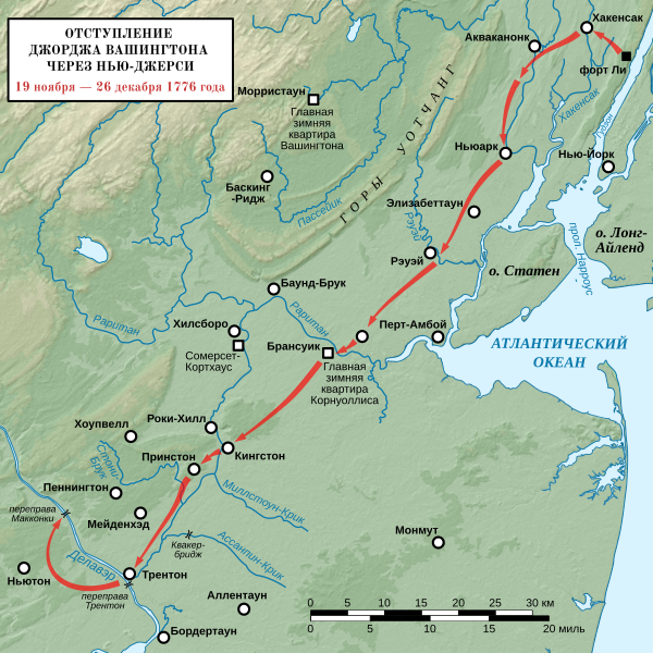 Теперь стало очевидно, что британцы намерены наступать на Нью-Джерси. Генералу Ли было приказано в этом случае спешить на соединение с армией Вашингтона, но он медлил. Вашингтон лично порекомендовал ему идти на соединение с основной армией, однако не отдал прямого приказа, предпочитая сохранять независимое командование. Между тем армия Вашингтона отступила к городку Хакенсак, но местность там была непригодна для обороны, а в форте Ли были потеряны все лопаты и кирки, и строить укрепления было нечем. 22 ноября Вашингтон отвёл армию в Ньюарк. Положение армии были критическим, Вашингтон раздумывал о том, чтобы отступить на западные окраины Пенсильвании или за Аллегенские горы[48]. Он собрал генералом, и спросил, следует ли армии отступать дальше на юг, или же лучше отойти в Морристаун, чтобы оказаться между британцами и Филадельфией, которая явно является их целью. Совет высказался за Морристаун, но Вашингтон решил продолжать отступление. У него было в тот день 5410 человек, хотя у 40% этого количества сроки службы истекали к 1 декабря. На второй день в Ньюарке Вашингтон ещё раз попросил генерала Ли идти на соединение с армией и запросил подкреплений у генерала Гейтса. Он надеялся отступить к Брунсвику и, если накопит достаточно сил, дать бой там[49].