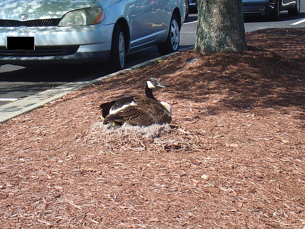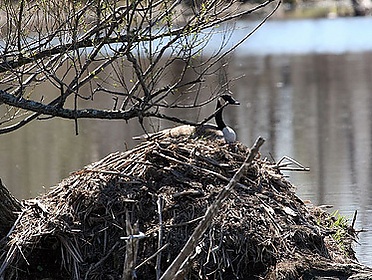 Гнездо обычно располагается на возвышенности у воды — ручья, озера, пруда или на бобровой хатке. Яйца откладываются в неглубокую ямку, выстланную растительным материалом и пухом.