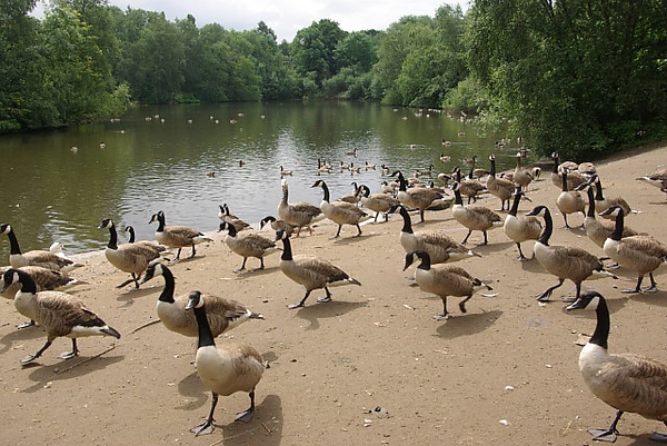 Попытка переселить гнездовые пары из сельскохозяйственных районов в 1950–60-х годах привела к образованию новых субпопуляций и взрывному росту численности[33]. Британские популяции наиболее многочисленны в Юго-Восточной Англии и Мидлендс, но распространились и на вересковые пустоши, водоёмы и населённые районы. Распространение и натурализация вида объясняются отсутствием конкурентов в экологической нише крупной водоплавающей птицы, предпочитающей парки и открытые леса (единственный значимый конкурент — лебедь-шипун), а также созданием благоприятных мест для гнездования (водохранилища, затопленные карьеры) и утратой миграционного инстинкта[31].