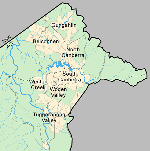 - Гангалин (англ. Gungahlin): заселён в 1990-х годах. В настоящее время 7 районов, планируется расширение.