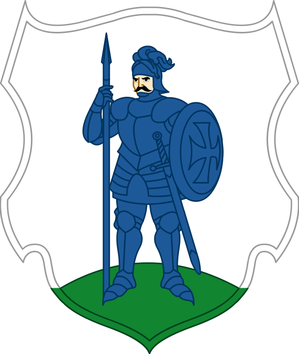 Гербом Канева со времён Речи Посполитой служило изображение воина с копьём или алебардой (видимо, в память о военном значении города). В описании герба, утверждённого Николаем I 26 декабря 1852 года, он толковался как «русский ратник XII века» и помещался на чёрном поле; самый герб был увенчан городской короной (элемент, перешедший в современный герб). Нынешний герб Канева утверждён горсоветом 7 декабря 1999 года. В лазурном поле на серебряном холме древнерусский ратник XII века в серебряных доспехах, красной накидке, сапогах и перчатках, с мечом в красных ножнах и красным щитом держит правой рукой боевую секиру с длинным черенком. Щит обрамлён декоративным картушем и увенчан серебряной городской короной с тремя башнями. Герб города спроектирован на основании прежних гербов XVIII—XIX веков, подчеркивая существование Канева уже в XII веке.[15]