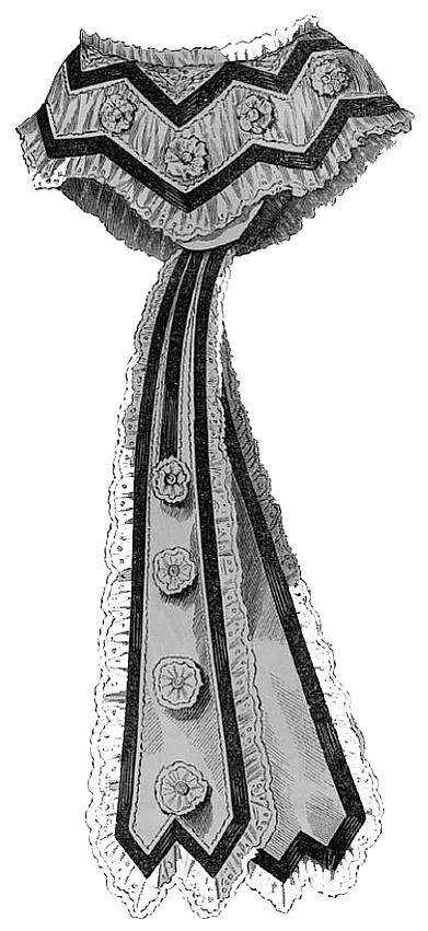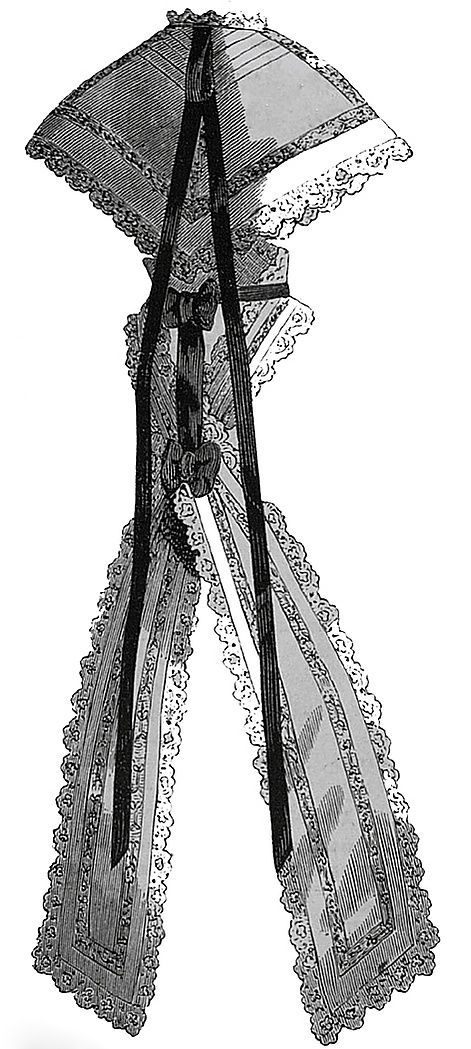 В это время популярна косынка фасона «Мария-Антуанетта» с длинными концами, завязанными сзади[2]. Имелся более длинный вариант подобной косынки, например, сделанная из кисеи, вышитых прошивок и кружева она скрещивалась сзади и связывалась двумя атласными бантами, последний из которых низко спускался на платье. Пришитые к воротнику длинные атласные ленты также спускались на платье и перемешивались с концами косынки[3]. Существовал иной способ ношения, при котором косынка скрещивалась на груди и висела концами спереди платья, придерживаемая кушаком, концы которого завязывались сзади. Косынка «Мария-Антуанетта» предназначалась для гардероба молодых женщин.